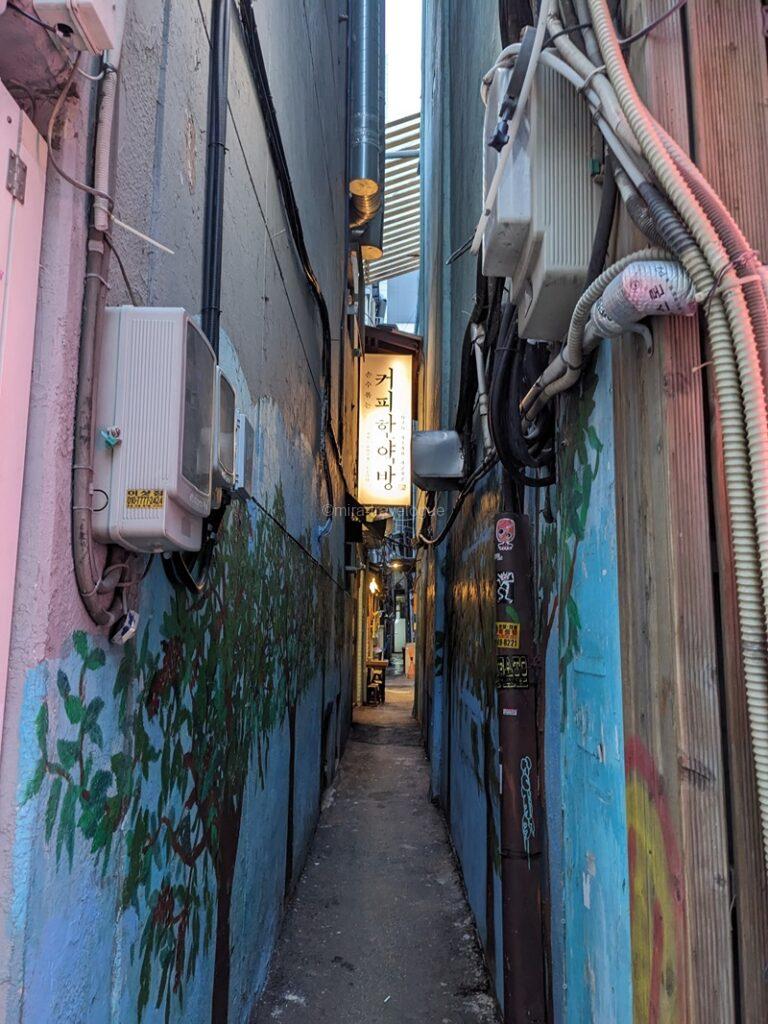 第2話で、ソンジェが運動している体育館でタバコの臭いがするのにソルが気づき、体育館裏でタバコを吸っている学生達を注意しに行った場面で登場した路地です。